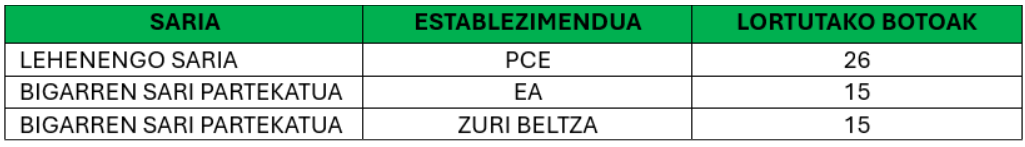 Lehen saria (diploma eta Udalak herriko establezimenduetan erosketak egiteko emandako 300 euroko balea): PCE