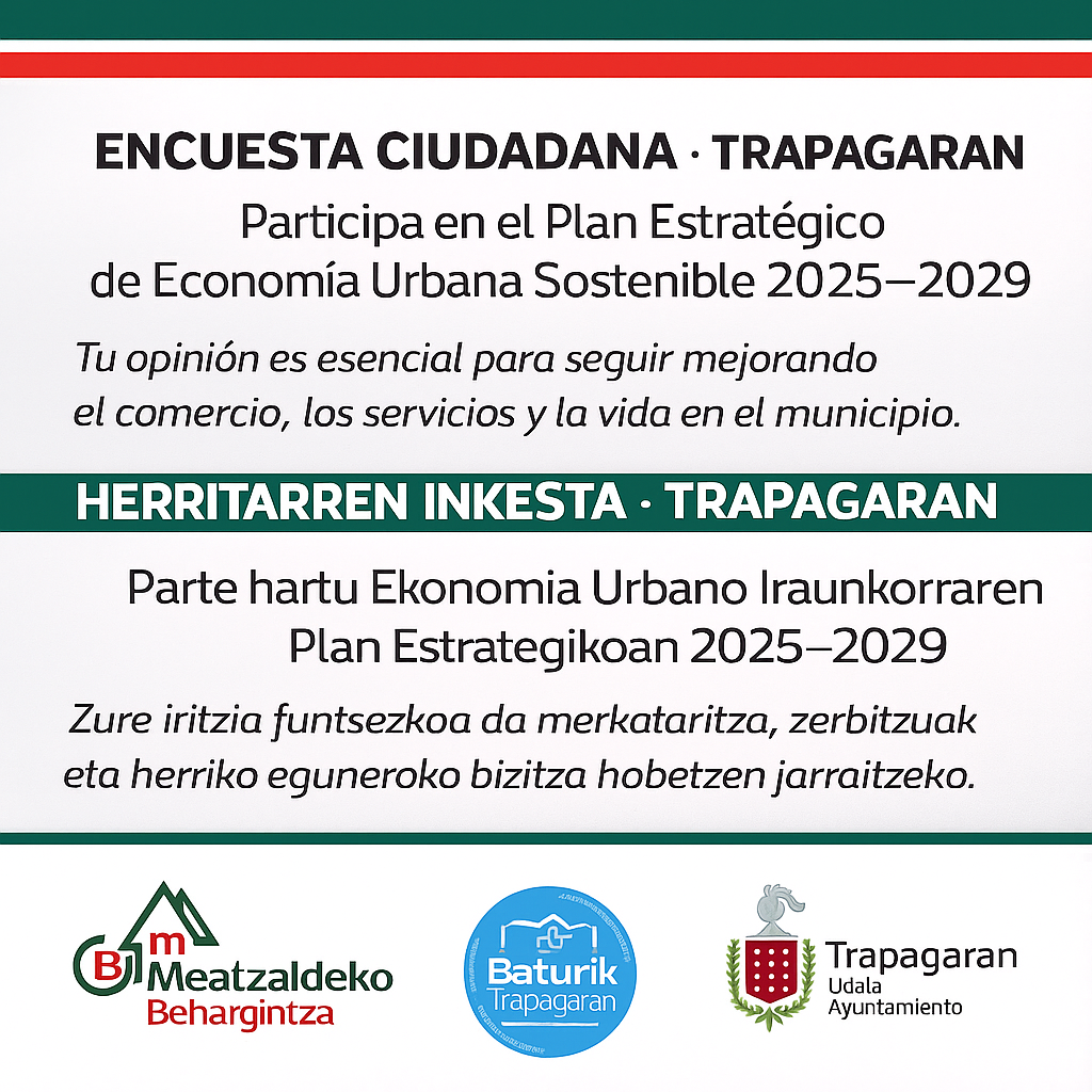 Meatzaldeko Behargintzatik, “Baturik” Trapagarango Merkataritza, Ostalaritza eta Zerbitzuen Elkarteak eskatuta eta Trapagarango Udaleko merkataritza arloarekin lankidetzan, herritarrei zuzendutako inkesta bat jarri dugu abian, 2025-2029ko Hiri Ekonomia Iraunkorraren Plan Estrategikoa egiteko prozesuaren barruan.